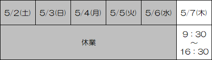 5/7(木)以降の営業時間は土日祝を除く月〜金の10:00~16:00となります。